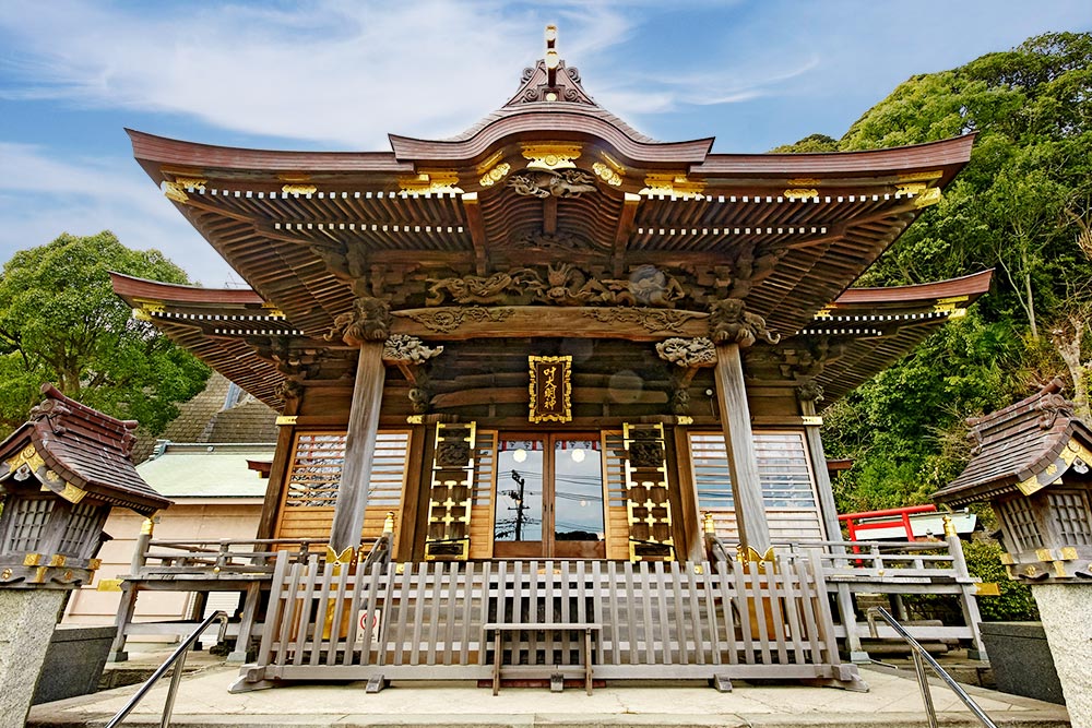 現在の社殿は、天保8年(1837)2月1日焼失し、天保13年に再建されたもので、本殿、弊殿、拝殿は一連の権現造りである。本殿、弊殿は総檜造りで、その経費おおよそ三千両を要し、以前にも勝る社殿の建立を見るに至った。